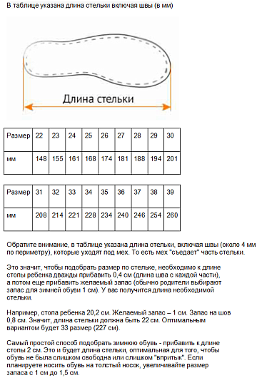 Валенки мы взяли 22 размера на стопу 13 см, затем нога у нас подросла до 13,5 см. Нога у нас узкая. По стельке 22 размер полностью соответствует таблице производителя - 14,8 см. Производитель указывает, что для правильного выбора размера нужно прибавить к длине стопы 0,8 см (по 0,4 см с каждой стороны стельки уходит под мех), а также желаемый запас (у нас это 1 см). На мой взгляд достаточно добавить к длине стопы 1 см (запас) и еще 0,5 см (уходит под мех), т. к. мех в процессе носки приминается.
